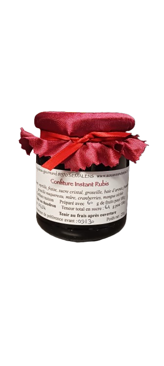 Ingrédient : myrtille, fraise, sucre cristal, groseille, baie d’aronia, framboise, groseille maquereau, mûre, cramberries, mangue séchées